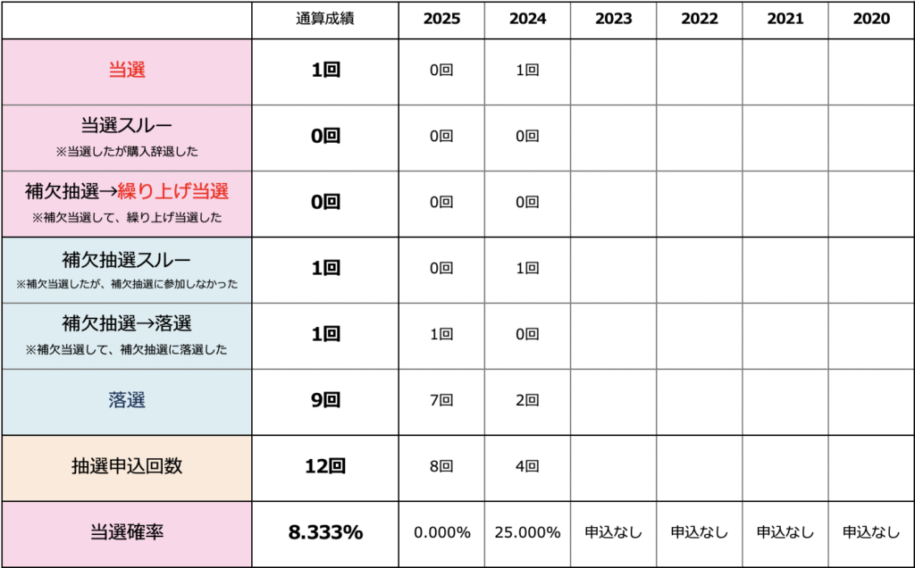 当選確率8.3%が高いと思うか低いと感じるかは人それぞれかと思いますが、