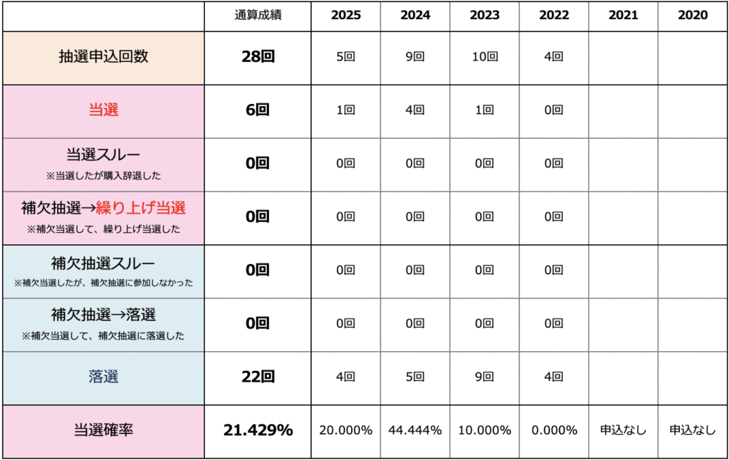 ですから当たらないのが当たり前と思って落選してもクヨクヨせずに、機械的に申込を続けましょう!