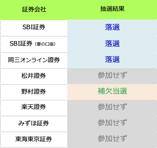 結果は主幹事の野村證券で補欠当選をもらいました。
