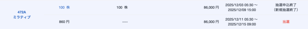 IPO株、ミラティブの抽選結果です!