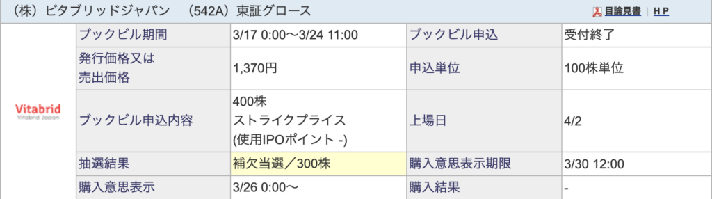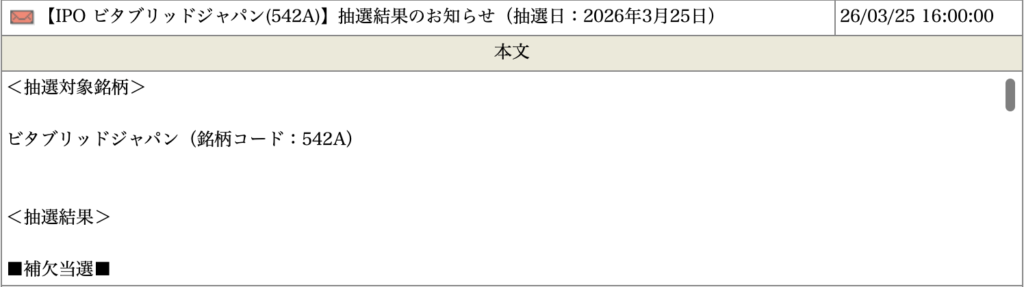 IPO株、ビタブリッドジャパンの抽選結果です!