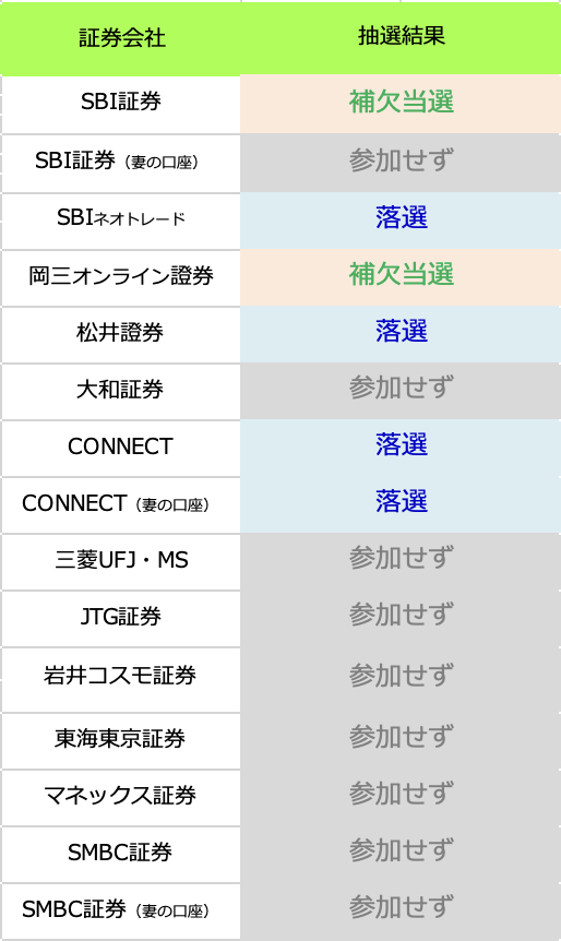 SBI証券、岡三オンライン証券で補欠当選となりました。