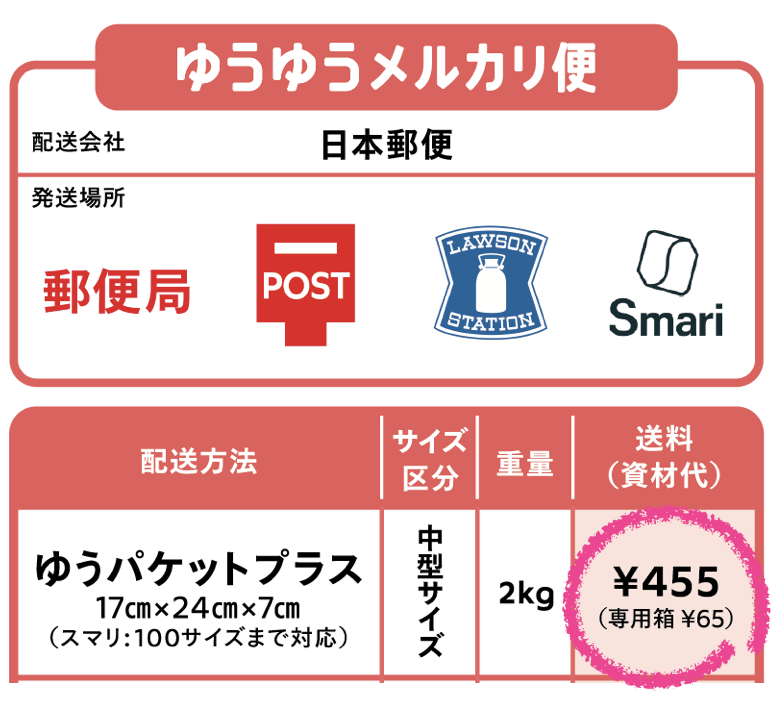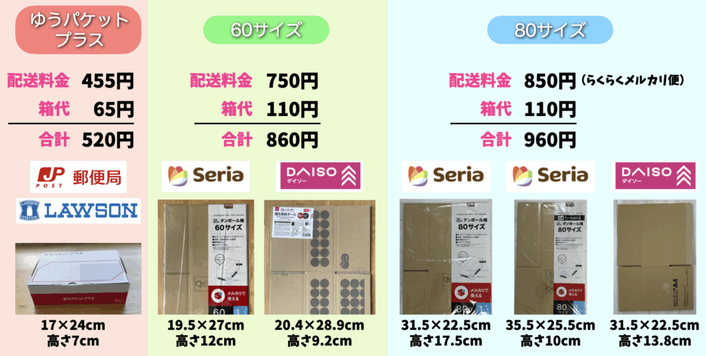 「ゆうパケットプラス」で梱包できれば一番安く送料455円に専用の箱代65円で合わせて520円で配送できます!