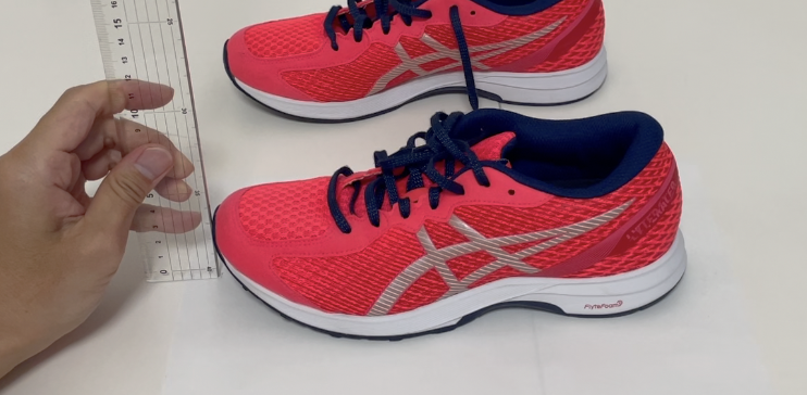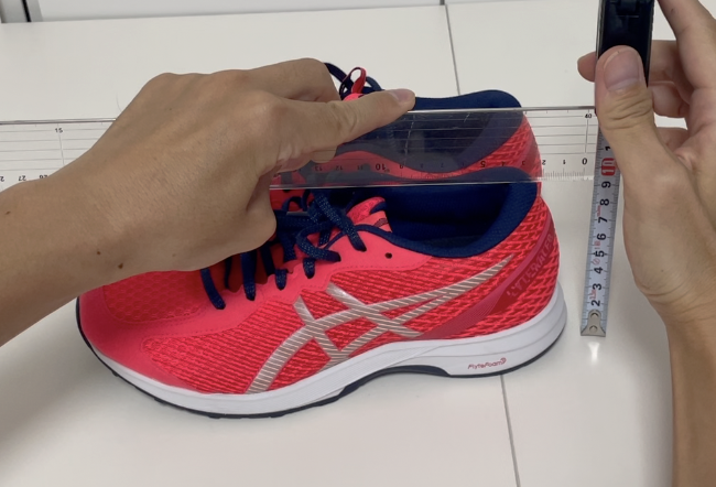 靴の高さが一番高いところに定規を置き、定規を机と並行にします。