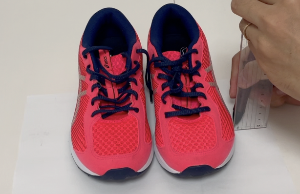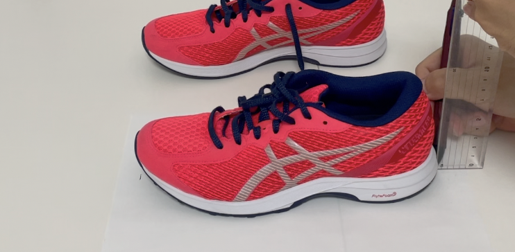 靴の下に紙を敷いて靴の先端に定規を垂直に立てて印をつけます。