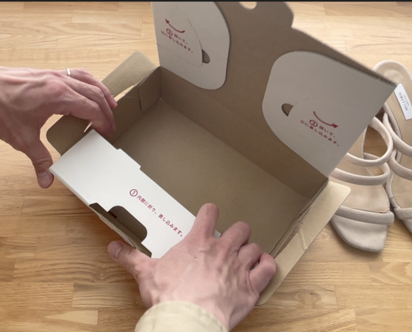 この箱は幅・奥行き・高さとバランスよく作られていていろいろな商品を入れるのに役に立ちそうですが、靴の梱包ということを考えると靴は高さがなく、平べったいものが多いので、この箱に靴を入れるとかなり無駄に上方向に空間ができてしまいました。