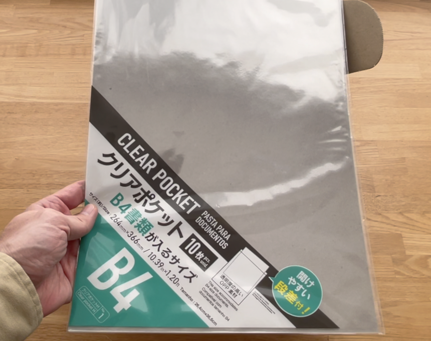 商品の水濡れ対策の袋はダイソーのB4サイズクリアポケットを使いました。