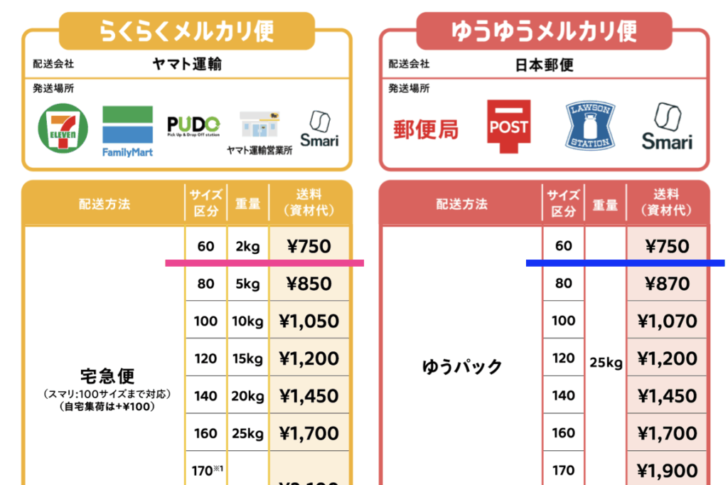 60サイズの配送料はらくらくメルカリ便もゆうゆうメルカリ便もどちらも750円で同じです。