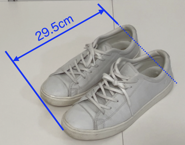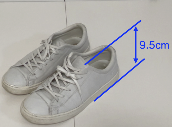 このスニーカーの外寸を測ってみると、靴の全長29.5cm・幅21cm・高さ9.5cmでした。