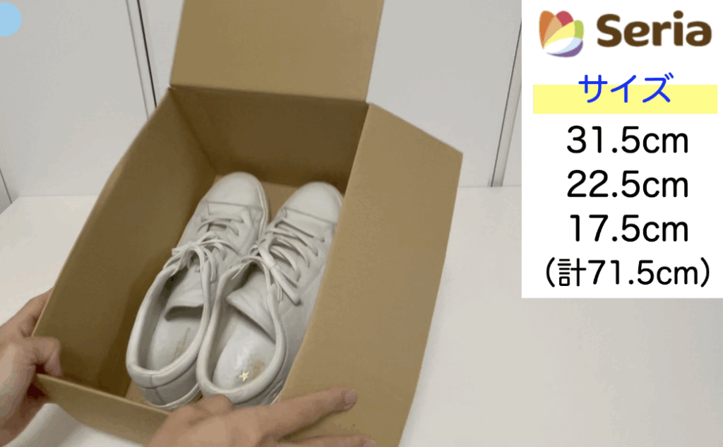 ①のセリアの箱は箱の長辺が31.5cmあるので、外寸29.5cmの長さの靴はぴったり入りました!