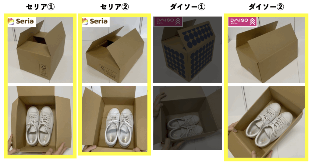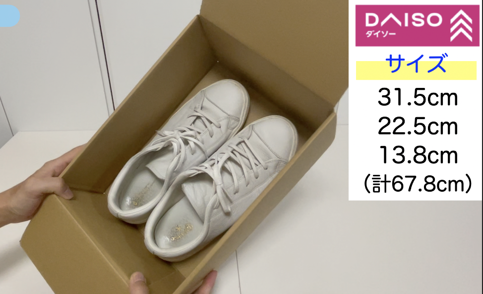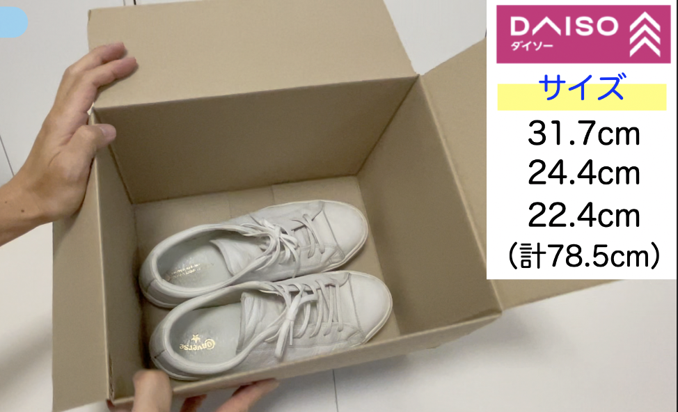 そういう意味ではダイソーの箱①は箱の高さがありすぎて上に無駄な空間ができてしまうので通常の靴の梱包には向いていないと思います。