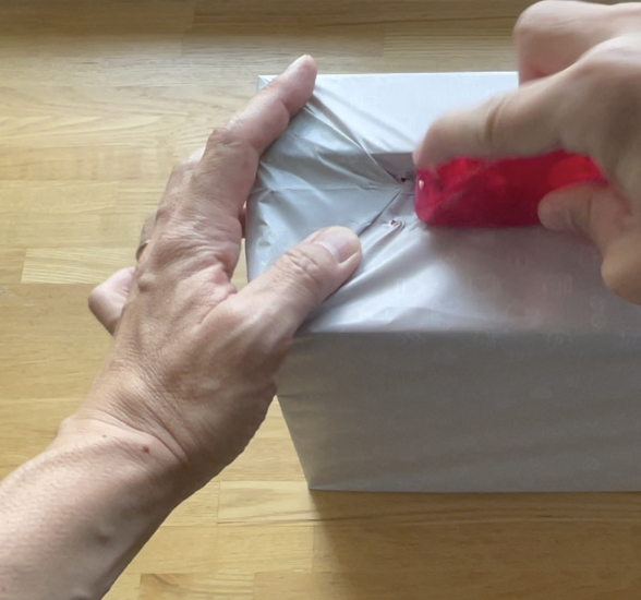 箱を袋に入れたらシールで袋を閉じて四隅のダブついた部分を折り返してテープ留めします。