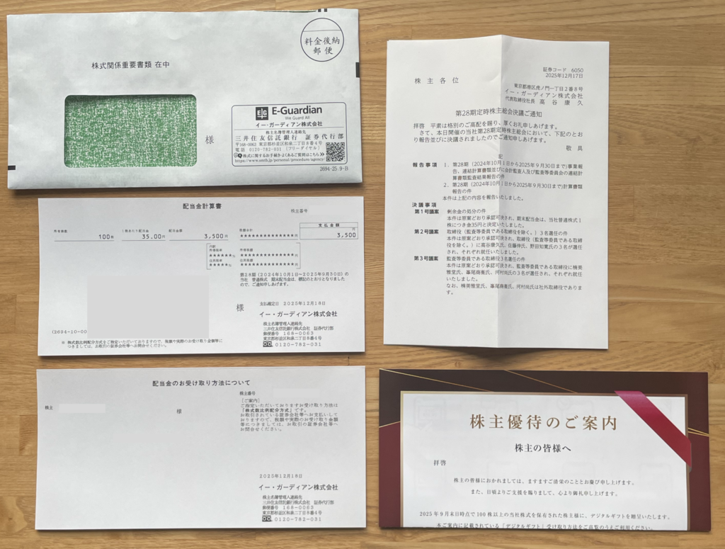 イー・ガーディアンの優待の内容、どんな優待が届くのか、いつ優待が届くのか、実際の取得状況、この優待はオススメなのか、といったことが気になっている方に役に立つ内容となっています。
