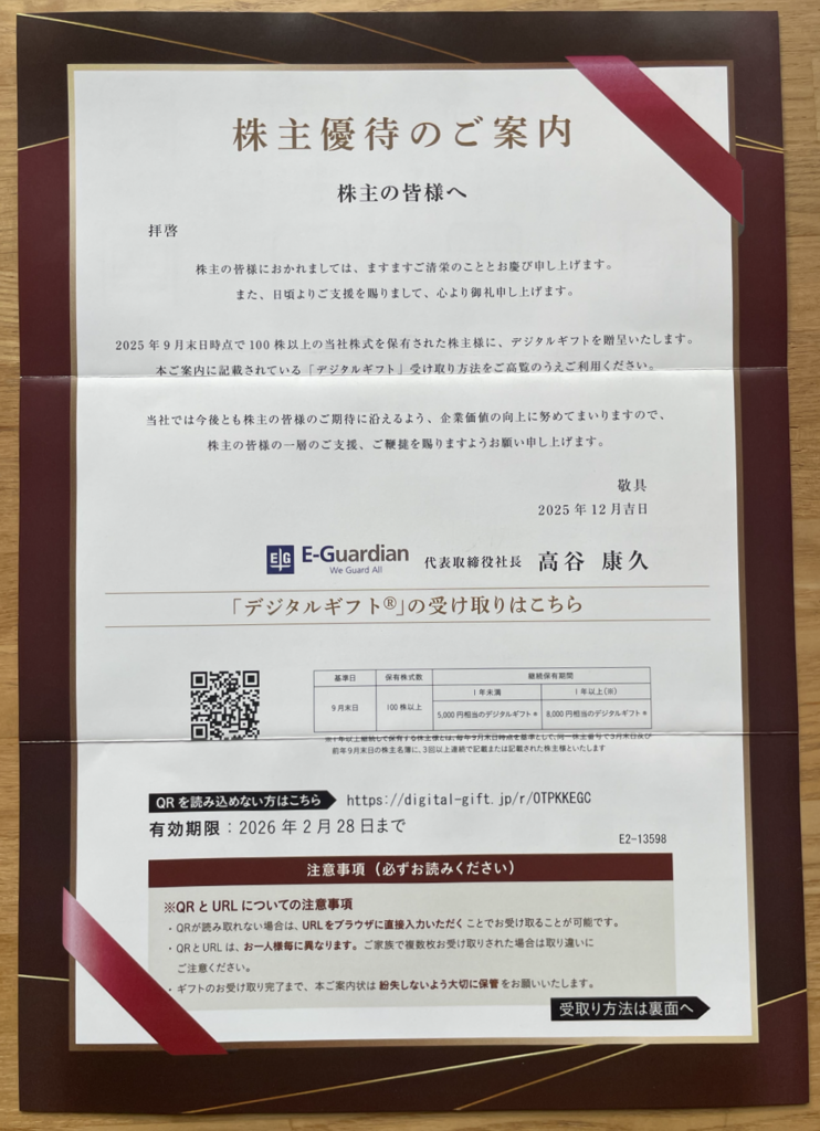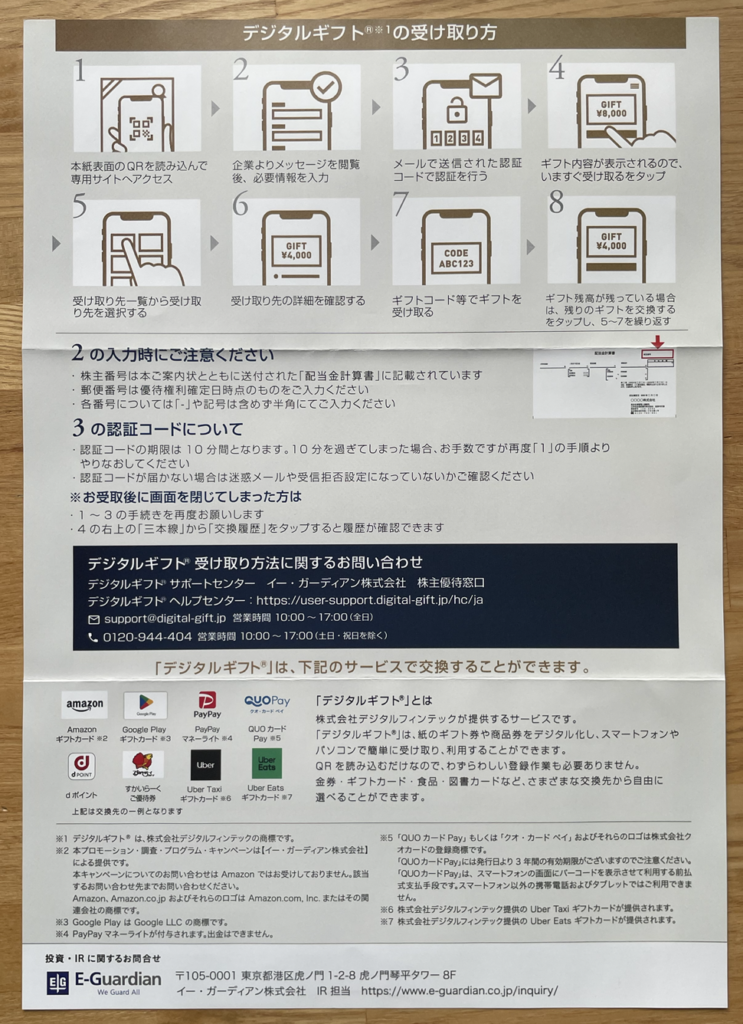 イー・ガーディアンの株主優待は2024年まではQUOカードでしたが、2025年からデジタルギフトに変わりました!