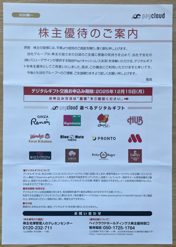 ペイクラウドHDの株主優待の評価
