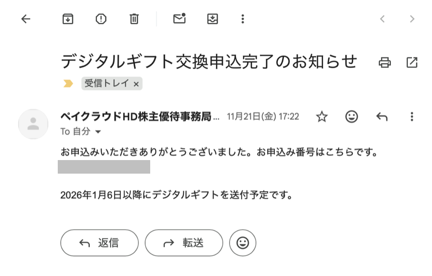 ただしメールに記載されている通り、申し込みが完了しても優待はまだ貰えません。