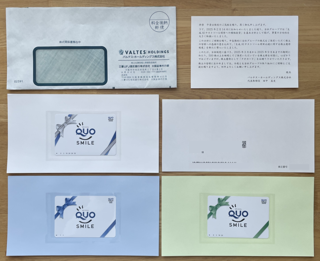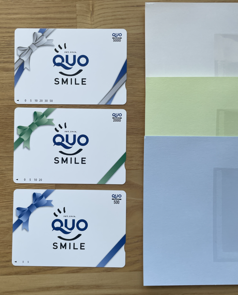 ゲットした優待:5,000円QUOカード1枚、2,000円QUOカード1枚、500円QUOカード1枚 計7,500円分のQUOカード