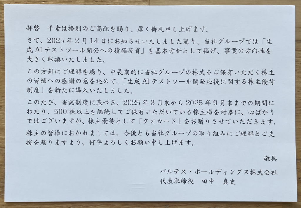 バルテス・ホールディングスの優待の内容、どんな優待が届くのか、いつ優待が届くのか、実際の取得状況、この優待はオススメなのか、といったことが気になっている方に役に立つ内容となっています。